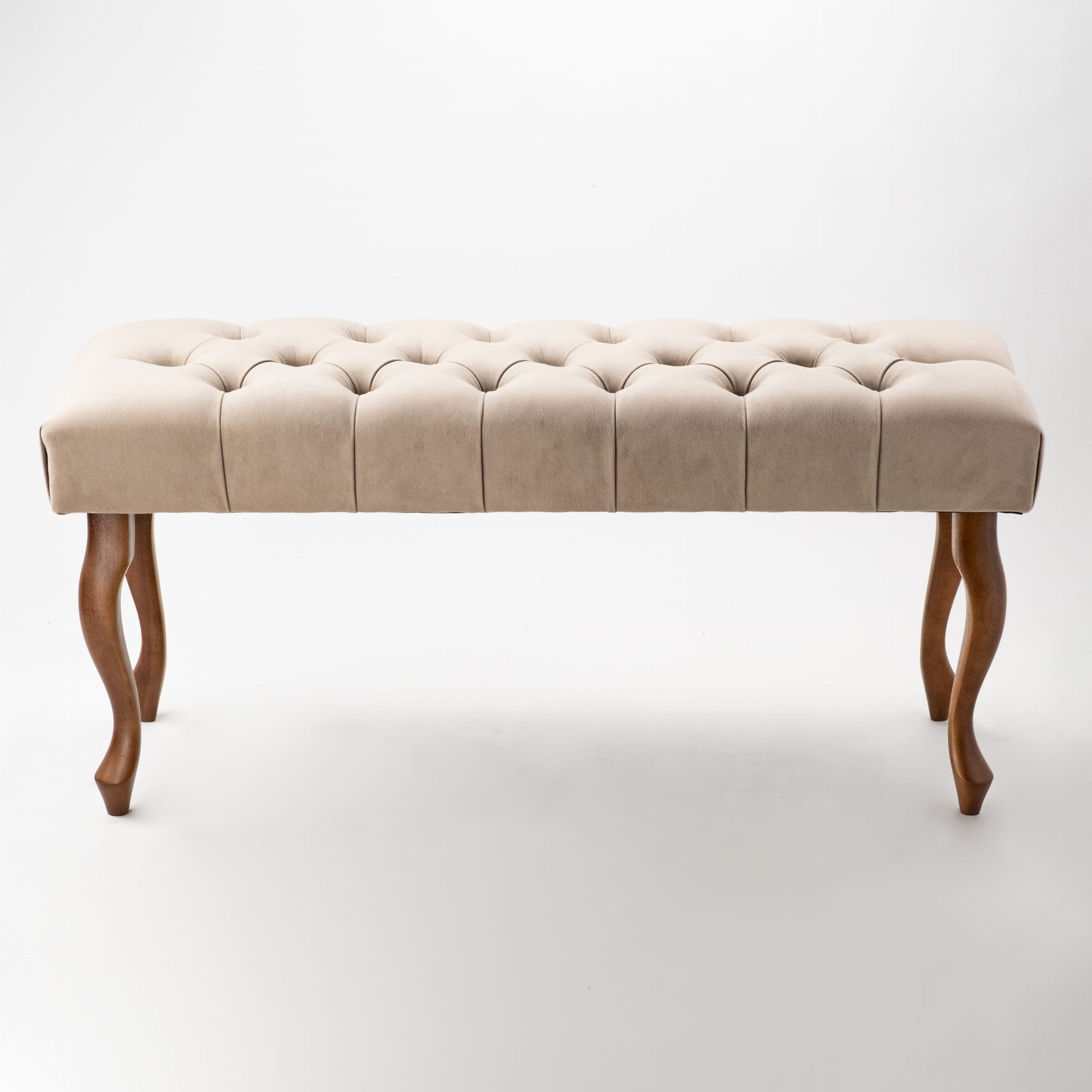 Handgefertigte Flurbank mit königlichen Beinen. Erstklassige Materialien und ein perfektes Finish. Der Saalsitz ist mit hypoallergenem Schaumstoff und dicker Watte gefüllt, wodurch er auch königlich sitzt. Der Stoff, der sie bedeckt, ist resistent gegen Flecken, Sonnenstrahlen und Abrieb. Die Beine sind aus Buchenholz, Klasse A, handmodelliert, mit absplitterungsbeständigem Lack besprüht.
